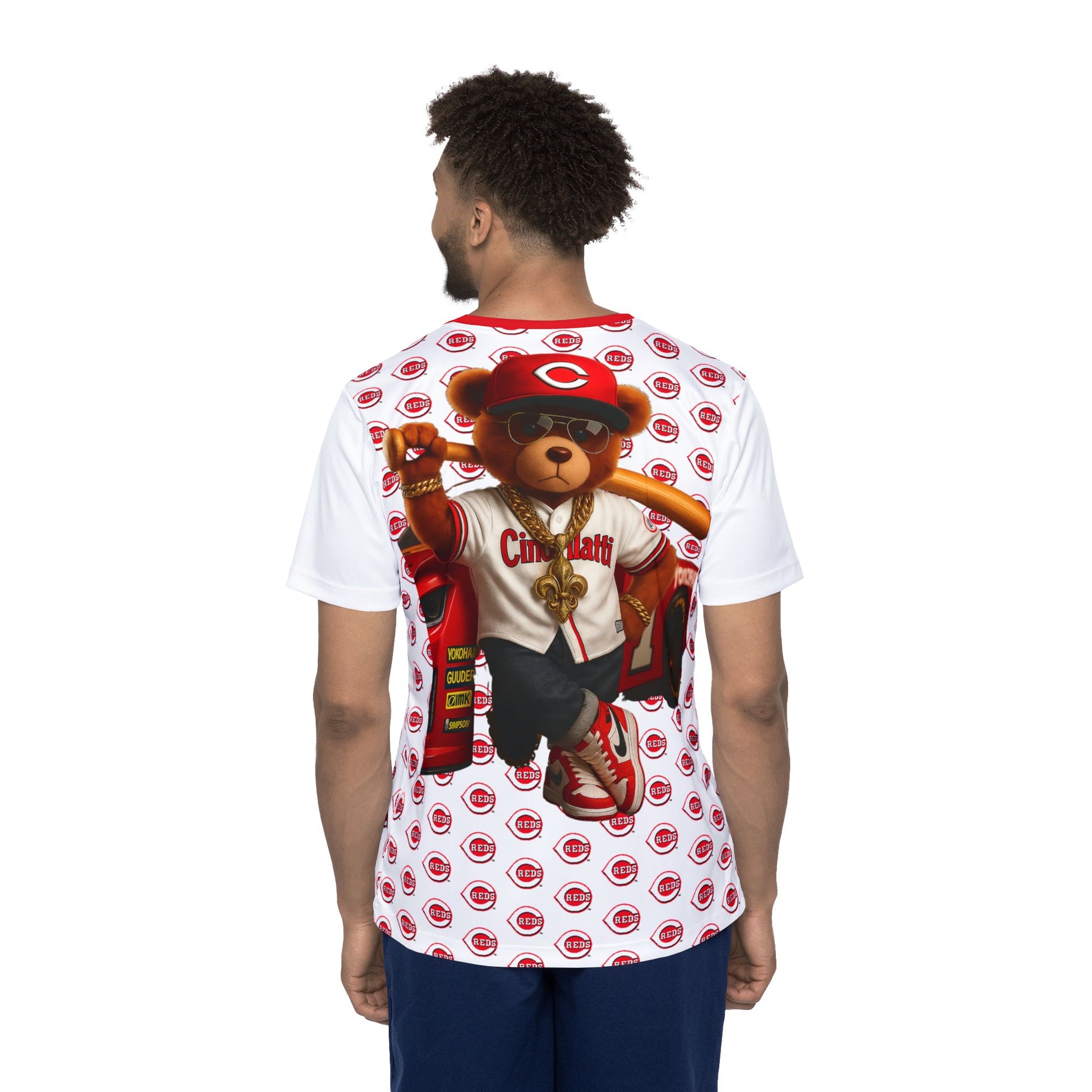 Cincinatti Reds Baseball, Bristol Motor Speedway, White Men's Sports Jersey with Bear Mascot, Cute Baseball Shirt, Sporty Casual Wear, Gifts for Sports Fans, MLB Team Apparel, Fun Birthday Present